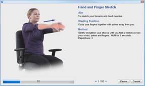 Optional exercise window. This window will display medically endorsed exercises suitable for computer users. The window will appear based on continuous use or accumulated use depending on the user settings. You may also choose to take exercises at any time.